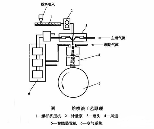 熔噴法生成的無紡布纖維更細(xì),表面積更大,具有更好的過濾性、屏蔽性、絕熱性和吸油性,這些是其他工藝生產(chǎn)的無紡布所不能比擬的。下圖為熔噴法工藝生產(chǎn)熔噴布原理圖。