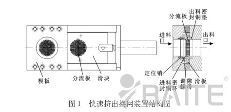 板式換網器結構:它主要過濾部件由滑塊、定位銷、進料密封銅環(huán)、調隙螺母、分流板和出料密封銅墊所組成,如圖1所示。調隙螺母主要作用是通過旋轉調節(jié),將進料密封銅環(huán)和滑板一端作密封緊配合,防止塑料溶液從進料密封銅環(huán)和滑板之間漏出;塑料溶液通過分流板進行過濾,過濾后的塑料溶液通過出料口流出。