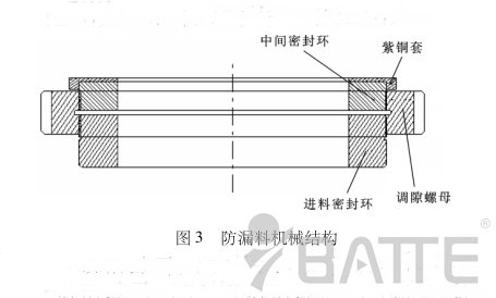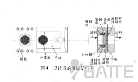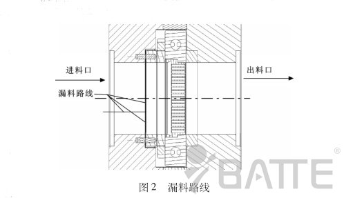 造成板式換網器密封處漏料原因:由圖1不難看出,在進料密封環(huán)通過調隙螺母與滑板緊密配合的情況下,進料密封銅環(huán)的另一端會和進料口的底端面分離,即產生一定的間隙。在這種情況下,要想真正不漏料,只有進料密封銅環(huán)的外徑和進料密封銅環(huán)放置槽的配合精度很高才行。但事實上,在加工中,由于加工誤差的原因,這種高配合是很難做到的,這時就會出現(xiàn)如圖2所示的現(xiàn)象,會產生微小的相對配合間隙。由圖2不難看出,當塑料溶液受到的壓力稍大時就會從產生的間隙中漏出來。